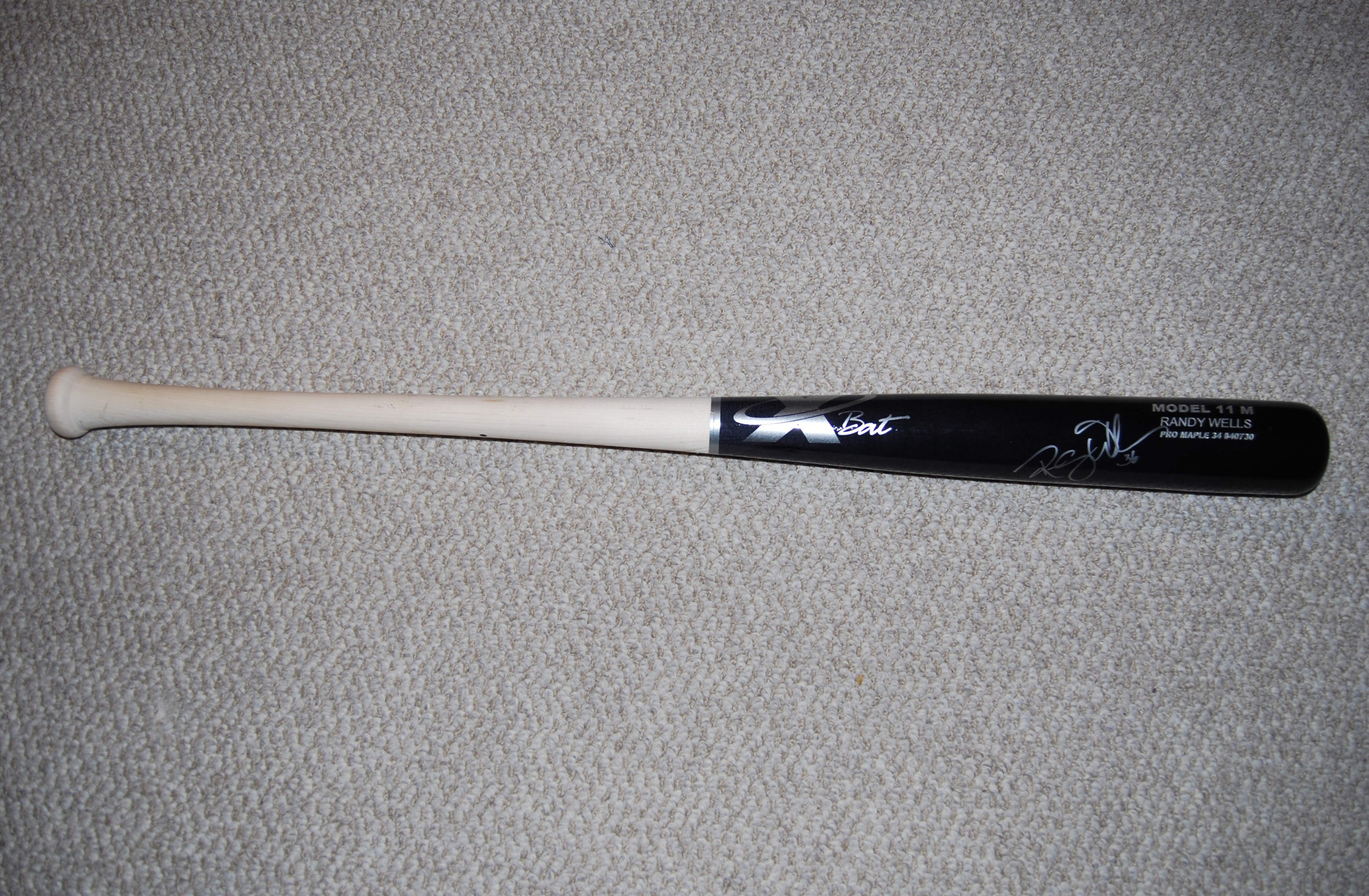 Game Used Pro Maple Black Bat. Bat is inscribed, shows 36 on the handle, and appears to be brand new. Item acquired via Randy Wells in person on 9/29/09.